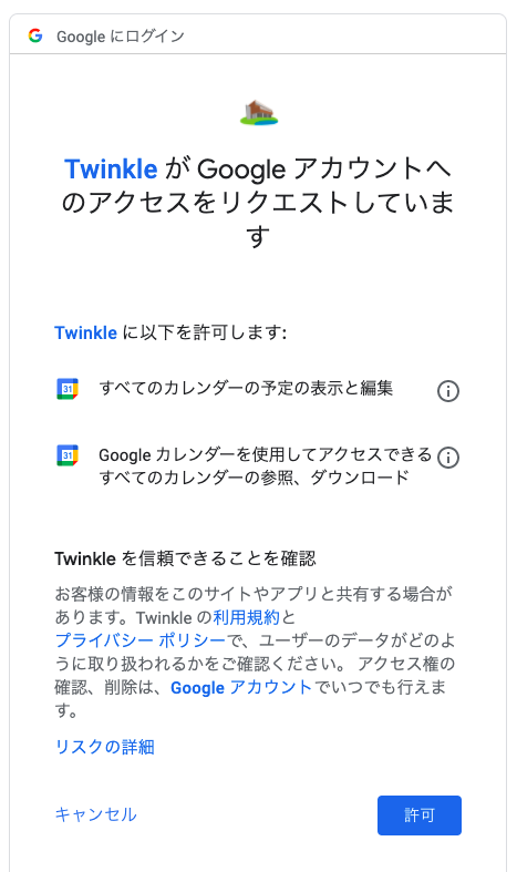 - Twinkle はバックグラウンドで Google カレンダーへアクセスし、自動で予定の書き込み・削除を行います。このため、ログイン時に「すべてのカレンダーのイベントの表示・編集」権限(